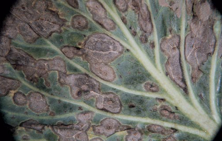 Des taches irrégulières, grises à brunâtres sur les bords et blanchâtres au centre, qui s’élargissent et se rejoignent :…