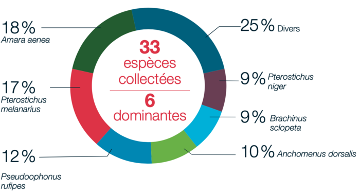 Ces carabes sont en majorité des espèces de milieux ouverts qui fréquentent régulièrement l’agrosystème arboricole. Néanmoins, on peut noter la présence de carabidés de milieux humides (12 % des effectifs), en lien avec la proximité du fleuve Rhône.