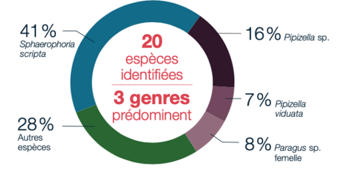 Dans cet inventaire, les effectifs de syrphes sont élevés (575 individus), mais les espèces peu diversifiées (20 au total). Ce sont des diptères très mobiles. Une majorité d’espèces (15, soit 98 % des effectifs) sont des larves terrestres et prédatrices aphidiphages, mangeuses de puceron. Cet auxiliaire joue donc un rôle certain dans la régulation naturelle des pucerons dans ce verger !