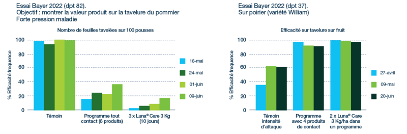 Dans le cadre d’essai « tavelure » sur pommes et sur poires, on observe une excellente efficacité des programmes à base de Luna Care (efficacité supérieure ou égale aux programme de référence) avec moins de passages. Ce qui permet de réduire l’IFT fongicide.
