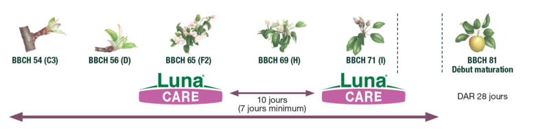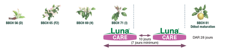 - 2 applications maximum de Luna® Care par ha et par an : si les applications sont consécutives, respecter un délai minimum de 7 jours entre les 2 applications ou utiliser une autre solution fongicide.