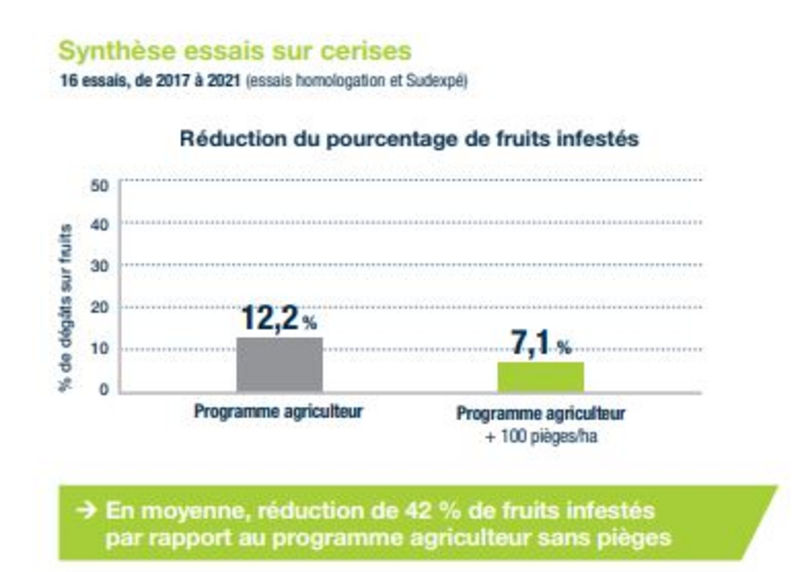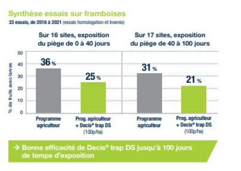 En complément de la stratégie insecticide de protection contre Drosophila suzukii, l’arboriculteur peut utiliser une solution de biocontrôle ; le piège Decis® trap DS va ainsi permettre de réduire le nombre de fruits infestés. Decis® trap DS s’utilise sur cerisier, fraisier, framboisier, cassissier, pêcher, prunier ...