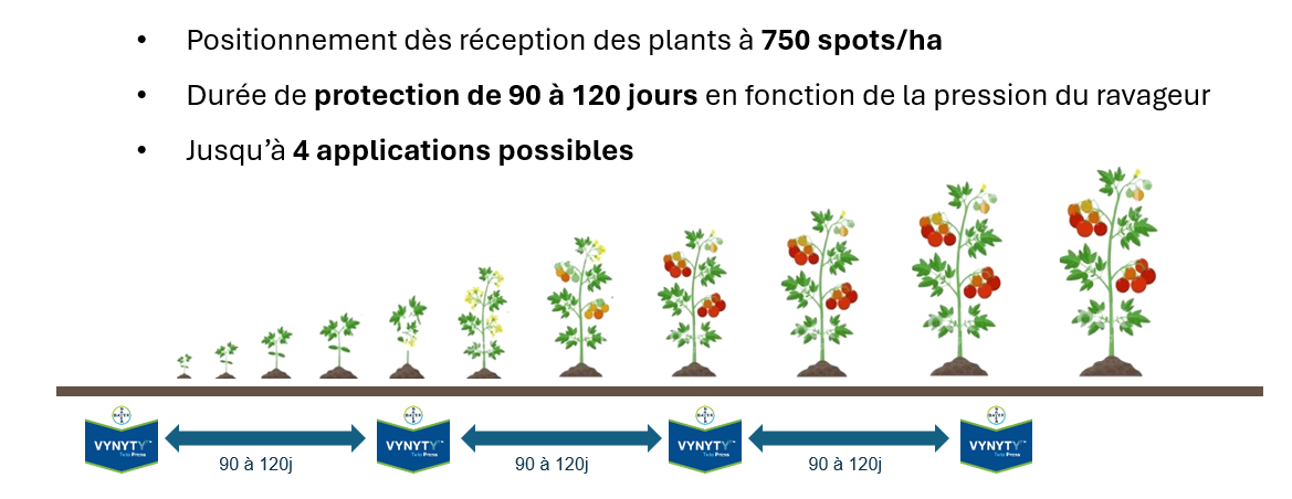 La gamme de solutions de confusion sexuelle biosourcées VYNYTY repose sur une technologie de pointe, permettant de contrôler efficacement trois lépidoptères ravageurs : la mineuse de la tomate (Tuta absoluta), la tordeuse orientale du pêcher (Grapholita molesta) et la tordeuse de la grappe (Lobesia botrana) . En effet, les phéromones spécifiques à chaque espèce sont microencapsulées dans un gel wax naturel contenant notamment de la cire et des huiles. Celui-ci est conditionné dans des poches recyclables via ADIVALOR qui alimentent une pompe à main. À l’aide de celle-ci, des spots de gel sont déposés sur les plantes ou les supports de culture. Puis, les phéromones se diffusent progressivement en saturant l’air pendant tout le cycle de culture. Les mâles, désorientés, ne retrouvent plus les femelles pour s’accoupler.