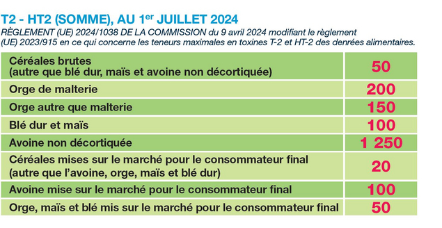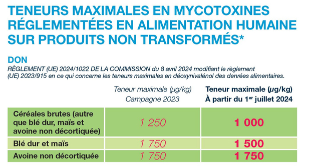 Toutefois, la réglementation sur les taux de mycotoxines dans les céréales destinées à l'alimentation humaine évolue en 2024. Ainsi, le règlement (UE) 2024/1022 de la Commission du 8 avril 2024 modifie le règlement (UE) 2023/915 pour les teneurs maximales en déoxynivalénol des denrées alimentaires. Les valeurs sont abaissées. À titre d’exemple, le nouveau règlement fixe le seuil de mycotoxines DON en blé tendre et orge à 1000 µg/kg contre de 1250 µg/kg auparavant. De nouvelles valeurs concernent aussi les produits transformés. De plus, les limites recommandées pour les toxines T-2 et HT-2 deviennent réglementaires. (Règlement (UE) 2024/1038 de la Commission du 9 avril 2024. Il modifie le règlement(UE) 2023/915 en ce qui concerne les teneurs maximales en toxines T-2 et HT-2 des denrées alimentaires.)