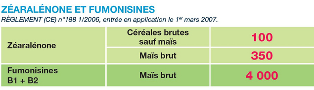 Depuis 2006 (Règlement CE n°1881/2006), la teneur maximale (µg/kg) en mycotoxine est réglementée dans les aliments bruts et transformés. Cela concerne les mycotoxines produites au champ, soit le déoxynivalenol (DON) de la famille des trichotécènes et la zéaralénone (ZEA). Des limites maximales réglementaires s’appliquent aussi à celles secrétées pendant le stockage, telles que l’ochratoxine A (OTA).