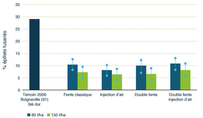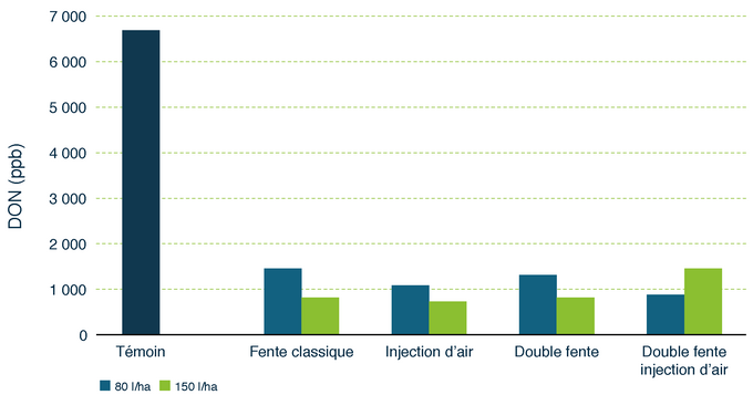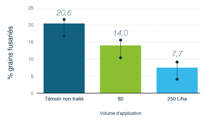 - Comme on peut l’observer dans les essais menés avec Arvalis, pour un même produit et un même type de buse, l’efficacité du traitement anti-fusariose est améliorée lorsque l’on passe de 80 à 250 l/ha.