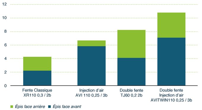 - Même si les buses double-fente améliorent la couverture de l’épis, il n’a pas été mis en évidence qu’elles amélioraient significativement l’efficacité.