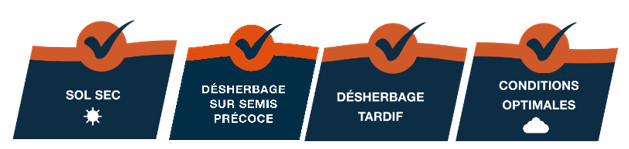 La particularité physico-chimique de l’aclonifène qui entraîne la formation d'un film à la surface du sol apporte d'autant plus de souplesse d’intervention à Mateno®. Dans l'idéal, Mateno s'applique dès la prélevée, au plus proche des semis, sur sol humide pour bénéficier de la fraicheur du sol, condition favorable aux matières actives à mode d'action racinaire. Lorsque les conditions sont difficiles, Mateno peut également s'appliquer sur sol sec sans pour autant perdre en efficacité. Le mode d'action spécifique de l'aclonifène contribue à sécuriser l'efficacité de l'herbicide.