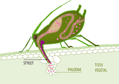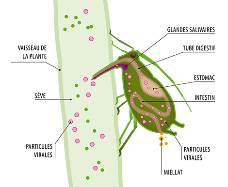 Grâce à son stylet, le puceron peut avoir accès aux différents tissus de la plante. Les composés dont il a besoin pour se nourrir sont dans la sève élaborée dans les vaisseaux de la plante. Grâce au stylet du puceron, le virus peut passer :