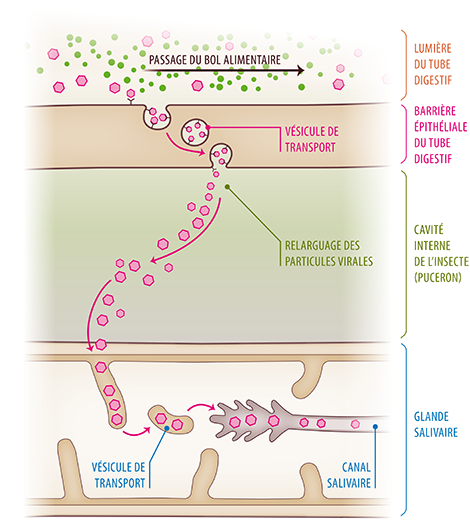 Les particules virales ingérées circulent dans le tube digestif. Certaine particules sont dégradées pendant la digestion ou éliminées dans le miellat, d’autres traversent la paroi de l’intestin et s’accumulent dans le corps du puceron.