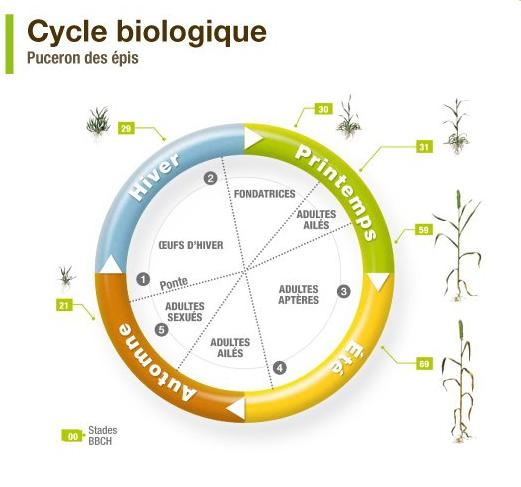 Les attaques se font par foyers. Les pucerons colonisent les feuilles supérieures puis se développent sur épis. Le puceron prélève de la sève et rejette des excréments qui favorisent le développement de fumagine qui est un facteur limitant la photosynthèse.