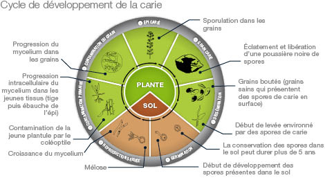 Les spores de carie germent et pénètrent dans le coléoptile du blé avant la levée. Au-delà de 2 feuilles, le blé n’est plus sensible. Les plantes cariées sont plus courtes avec des épis et un tallage moindre.