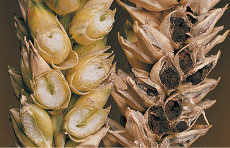 - À maturité : les épis sont ébouriffés et les grains détruits.