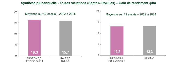 Depuis 2022, Bayer a mené de nombreux essais pour évaluer les packs Jessico® One / Silvron®. Dans ce cadre, Jessico® One à 1 l/ha associé à 0,5 l/ha de Silvron® / Népal® est comparé à d’autres références du marché. Résultat, efficacité et gain de rendement sont au rendez-vous dans des situations de complexes maladies, septoriose +/- rouilles.