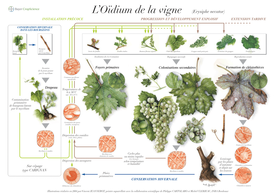 Contrairement au mildiou, l’oïdium est un parasite externe à la vigne. Le mycélium est donc à la surface des organes et doit émettre des suçoirs pour se fixer et se nourrir. La formation des suçoirs est impossible en présence d’un film d’eau et les conidies éclatent dans l’eau. Par contre une forte humidité (qui peut être présente à la surface des feuilles) est favorable à leur germination et à leur croissance. La durée d’incubation des conidies varie de 5 à 7 jours voire plus en fonction des conditions de température (elle augmente pour des températures plus élevées).