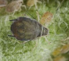 Le puceron cendré possède des ailes noires avec une tache brillante sur l’abdomen vert.