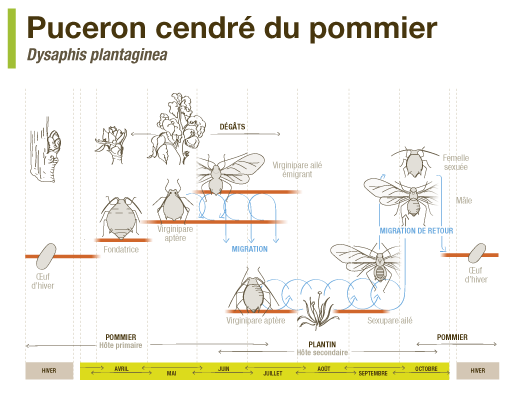 La particularité du puceron cendré est qu’il migre sur un hôte secondaire entre la mi-juin et la mi-juillet : le plantain, une plante herbacée. Il atterrit ensuite sur le pommier en septembre. Les femelles pondent sur l’arbre. Les œufs hivernent et éclosent au printemps suivant.