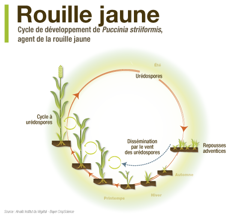 La rouille jaune est un pathogène obligatoire, nécessitant une plante hôte pour survivre et se multiplier. Elle se développe en condition de forte humidité et à des températures basses, avec un optimum aux alentours de 11°C (min - max : 0°C - 23°C). En hiver, le champignon survit sur les jeunes pousses de blé. Si les conditions le permettent, les premières lésions peuvent apparaître.