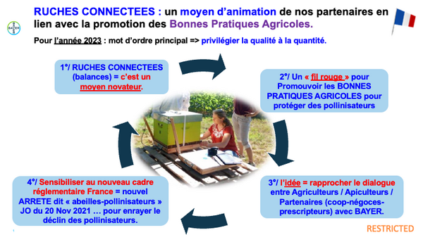Animée par le réseau commercial Bayer depuis de nombreuses années (début en 2015 avec une multitude de parties prenantes de la filière agricole (distribution agricole + prescription), cette action a comme objectif principal la promotion des Bonnes Pratiques Agricoles B.P.A. / préservation biodiversité et notamment des abeilles domestiques. Pour montrer qu'il s’agit d’un engagement dans le temps, elle est inscrite au plan RSE (Responsabilité Sociétale des Entreprises) de l’entreprise Bayer.