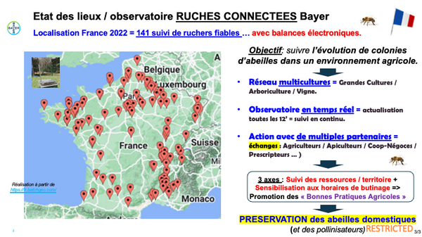 Bayer réalise donc avec ses partenaires des suivis de ruchers à l’aide d’un matériel performant, simple que sont les balances électroniques connectées. Ces dernières enregistrent, en temps réel, différents paramètres comme le poids des ruches, la température, … assurant une traçabilité des chiffres avec une visualisation possible sur smartphone (en saison), ordinateur, tablette (en saison, pour bilan annuel, ...)