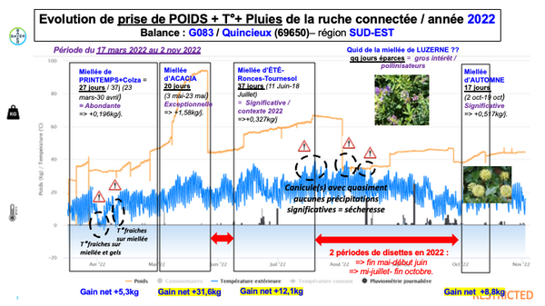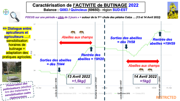Ces données numériques centrales et cruciales indiquent l’activité de la colonie d’abeilles dans le milieu agricole ciblé, tout au long de la saison. Elle permet par exemple de déterminer les périodes de ressources-disettes alimentaire, mais aussi les plages horaires de butinage des abeilles.