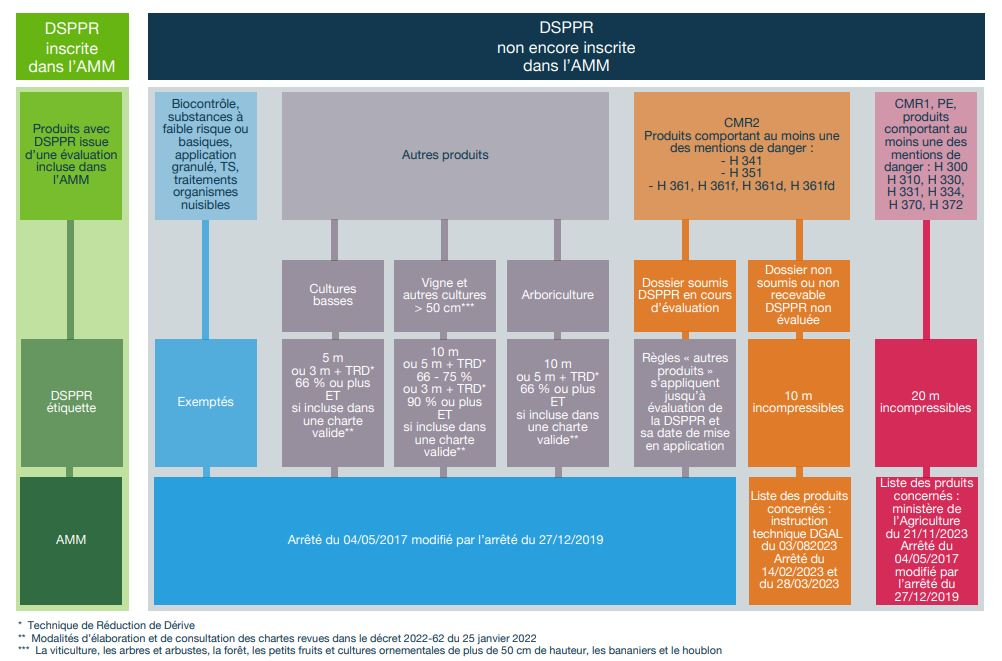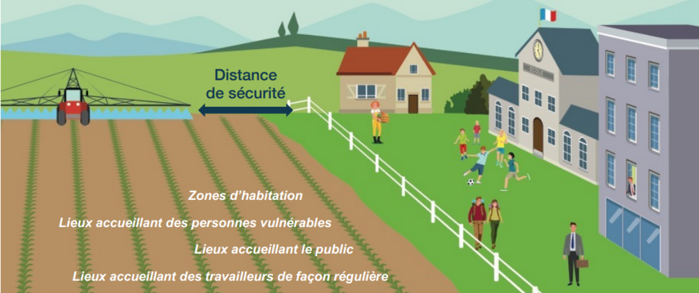 Des « Distances de Sécurité » vis-à-vis des Personnes Présentes et des Riverains (DSPPR) sont évaluées de manière spécifique dans les Autorisations de Mise sur le Marché (AMM), et reportées sur les étiquettes des produits.