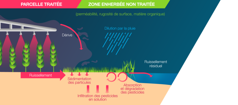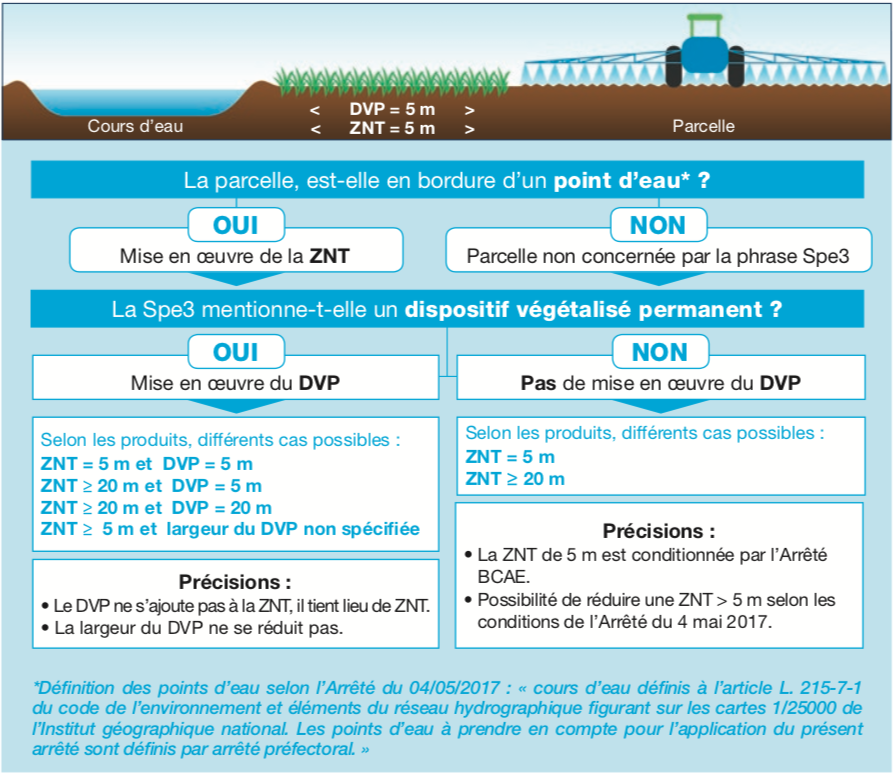 Exemple de phrase SPe3 : " Pour protéger les organismes aquatiques, respecter une zone non traitée de 20 m comportant un dispositif végétalisé permanent d'une largeur de 5 m en bordure des points d'eau. "