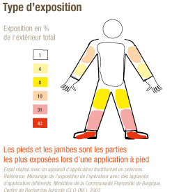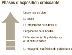 Dans le cas de l’exposition aux produits phytosanitaires, l’évaluation des risques consiste à apprécier le danger (toxicité du produit, mentions de danger "H" ), la nature (formulation liquide, solide, brouillard de pulvérisation) et le type et le degré d’exposition (pesée, manipulation, traitement avec ou sans cabine, cultures hautes ou basses,…).