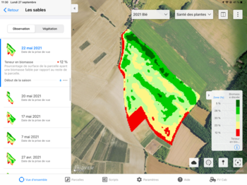 Grâce à des images satellites de haute qualité, FieldView™ vous embarque dans de véritables tours de plaine interactifs. « En saison, les images de biomasse sont envoyées toutes les semaines. Une vue du ciel des parcelles aide à repérer des manques à la levée, des défauts de croissance, des attaques de ravageurs, des « ronds » de maladies... et ainsi, à cibler les endroits du champ à visiter en priorité. »