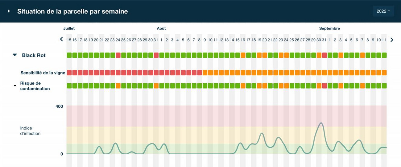 Chaque modèle évalue les contaminations à la parcelle en fonction des données climatiques, agronomiques, du cépage et du stade phénologique de la vigne pour prédire à 7 jours le risque maladies. L’objectif premier est de savoir à quel moment positionner le fongicide.