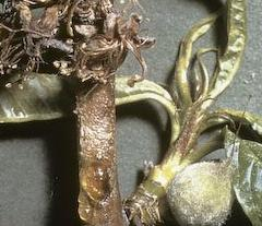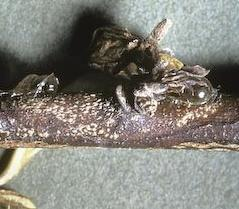 Sur rameaux, les chancres apparaissent quelques semaines après la floraison. Le bois devient noir.