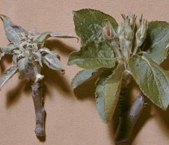 Sur pommier et poirier, les inflorescences sont atrophiées et les feuilles brunissent. Les fruits sont peu atteints.