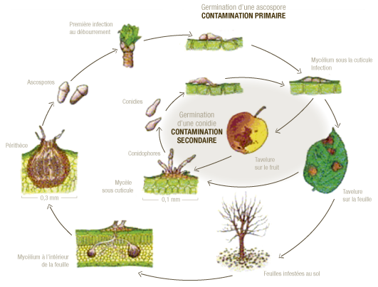 Les feuilles contaminées tombent sur le sol à la fin de l’automne. Au printemps suivant, les ascospores ayant atteint leur maturité sont libérées au gré des évènements pluvieux et vont contaminer le feuillage. Les spores germent sur les organes de l’arbre en fonction de l’humidité et de la température. Elles sont ensuite véhiculées par le vent et contaminent le verger.
