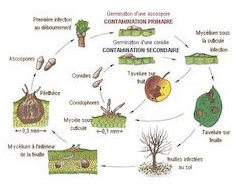 Les feuilles contaminées tombent sur le sol à la fin de l’automne. Au printemps suivant, les ascospores ayant atteint leur maturité sont libérées au gré des évènements pluvieux et vont contaminer le poirier : c’est l’inoculum primaire. Les spores germent sur les organes de l’arbre en fonction de l’humidité et de la température. Apparaissent alors des taches porteuses des conidies qui forment les contaminations secondaires.