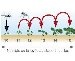 Mais il engendre également des dégâts indirects : cet insecte est en effet vecteur de trois virus responsables de pertes de rendement allant jusqu’à 8 q/ha. Les symptômes sont rares. Les feuilles atteintes peuvent se décolorer et présenter des marbrures. La nuisibilité due à la transmission de ces virus est d’autant plus forte aux stades précoces du colza, de la levée au stade 6 feuilles.