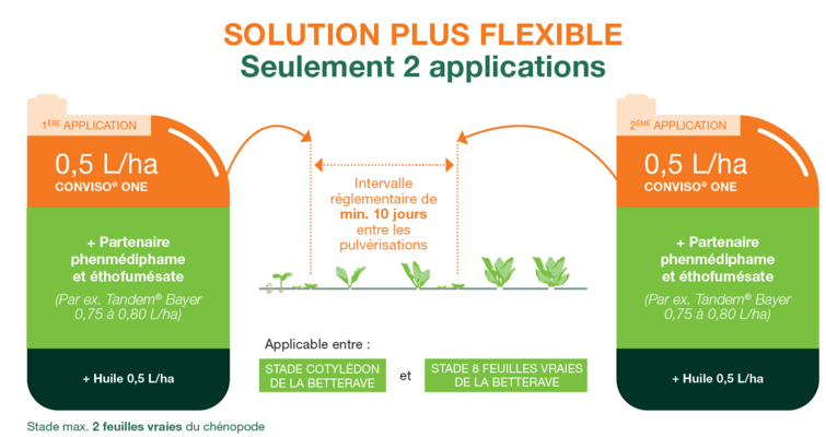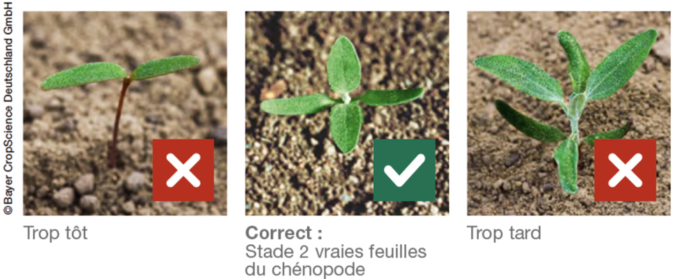 Dès l'apparition de chénopodes blancs (Chenopodium album) au stade 2 feuilles vraies dans la parcelle, l'application avec l'herbicide CONVISO® One doit être déclenchée :