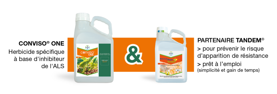 L’herbicide CONVISO® One appartient à la famille des inhibiteurs de l’ALS. Seulement deux applications sont nécessaires pour obtenir une efficacité maximale. Cependant, il s’applique systématiquement avec un herbicide partenaire. Cette association prévient le risque d’apparition de résistance. Dans ce cas, Bayer recommande d’utiliser TANDEM.