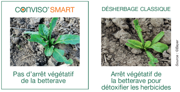 Lors du désherbage classique, la betterave réserve son énergie pour détoxifier l’herbicide au détriment de son développement. En revanche, l’herbicide CONVISO® One étant totalement sélectif des variétés de betteraves CONVISO® SMART, aucun n’arrêt de croissance ne se constate.