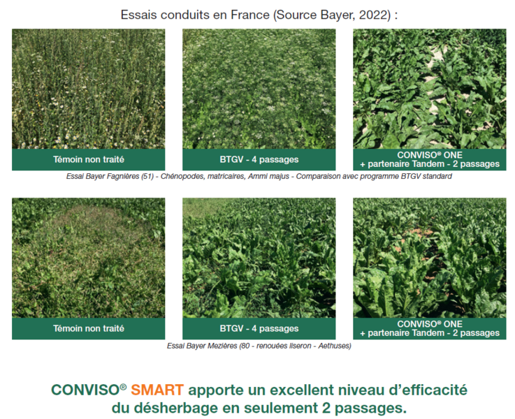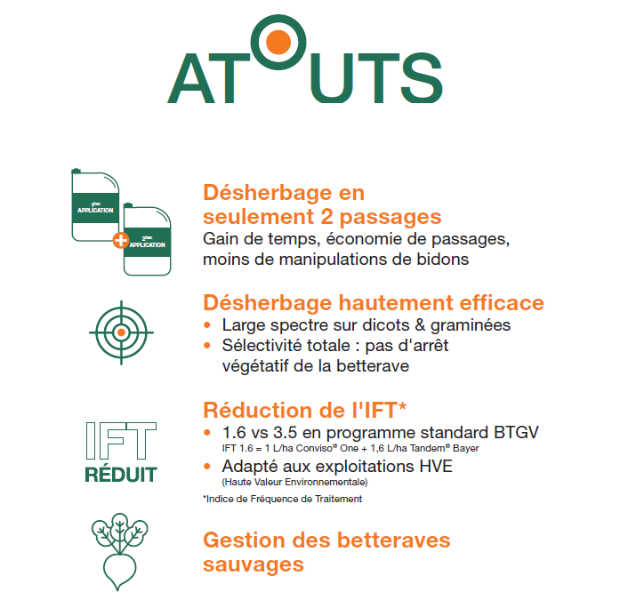 Comparé à une stratégie de désherbage classique BTGV, l’association d’une variété de betterave tolérante à un herbicide de la famille des ALS permet de réduire le nombre de passages grâce à un haut niveau d’efficacité. De plus, l’herbicide CONVISO® One touche un large spectre de dicotylédones et de graminées. Il est appliqué avec un partenaire type Tandem afin de prévenir tout risque de résistance de la part des adventices.