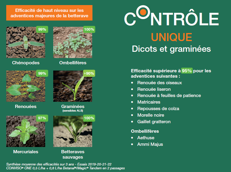 - le nouvel herbicide CONVISO® One, pour un contrôle de haut niveau des adventices en betteraves sucrières (à associer aux solutions Betanal® Tandem / Magic® Tandem).
