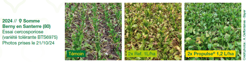 Dans le nord de la zone betteravière, la cercosporiose progresse vite : en 2024, 43 % des surfaces picardes nécessitaient un 3ᵉ traitement, contre seulement 2 % en 2022. Propulse® / Yearling ® s’impose alors comme une solution performante pour renforcer l’efficacité des programmes.