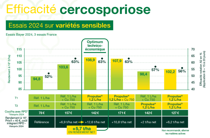 Face à la forte progression de la cercosporiose de la betterave, Propulse®/Yearling® améliore l’efficacité des programmes fongicides et la gestion des résistances. Les résultats des essais menés en 2024 révèlent le meilleur compromis technico-économique lors d’une application du fongicide en T1 dans un programme.