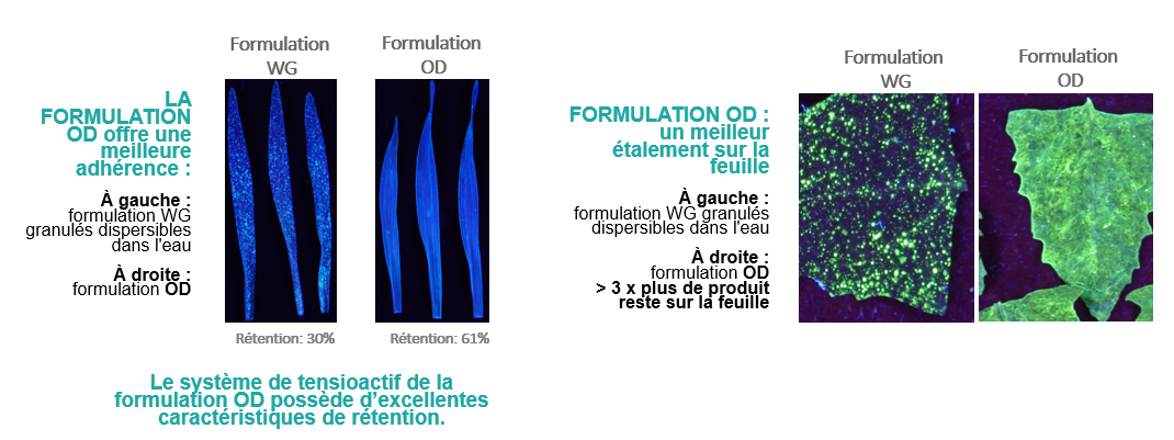 - Formulation : technologie OD : meilleur étalement des gouttelettes sur la feuille, meilleure adhérence, meilleure pénétration des substances actives, moins dépendant des conditions climatiques