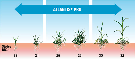 Atlantis® Pro est homologué de 3 feuilles à 2 nœuds de la céréale en sortie d’hiver.