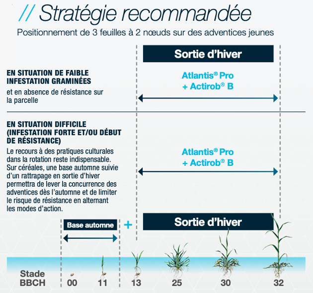 - En situation de faible infestation graminées et en absence de résistance sur la parcelle, Atlantis® Pro s’utilise de 3 feuilles à 2 nœuds de la céréale en sortie d’hiver.