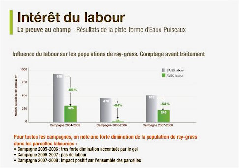 Ces exemples montrent que le labour est bien l’un des piliers du raisonnement de la stratégie de désherbage durable. Il permet dans des situations de forte infestation, d’échec de désherbage de réduire significativement le nombre d’adventices levées. Les pratiques agronomiques, labour, faux semis, couplées à l’utilisation judicieuse d’herbicides permettent de rendre des situations catastrophiques en situation gérables. Le plus efficace des herbicides ne pourra donner satisfaction que sur 100% des adventices levées et ne détruira sur une année qu’un dixième du potentiel de population présent dans le sol. En effet, seul 10% du stock lève chaque année. En ajoutant des pratiques agronomiques, le stock semencier diminue plus vite.