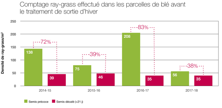 Les résultats enregistrés ces dernières années démontrent l'efficacité du décalage de la date de semis. Décaler le semis permet ainsi de diminuer l'infestation de ray-grass de façon très importante, et peut aller jusqu'à - 83 % sur certaines années.