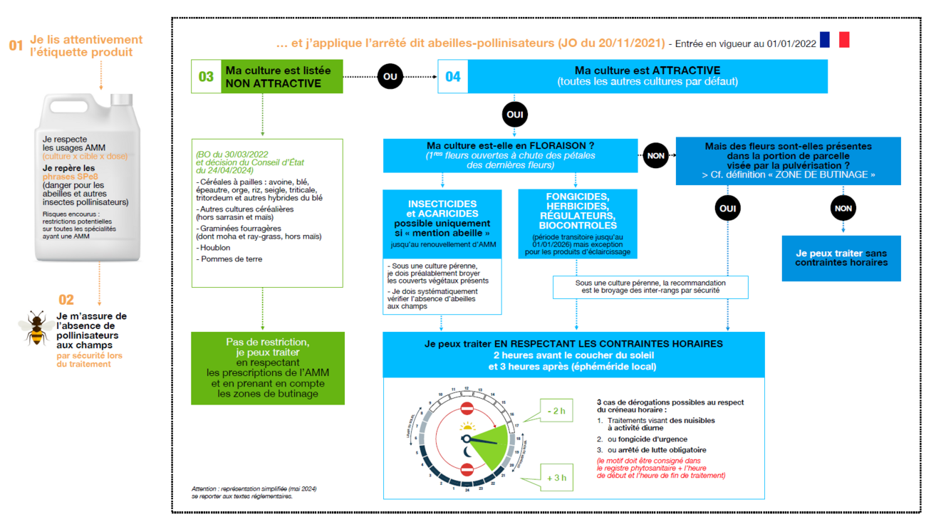 L’application des produits phytosanitaires sur les cultures attractives en floraison ou sur les zones de butinage ne peut s’opérer que dans les 2 heures précédant le coucher du soleil et les 3 heures suivant son coucher.
