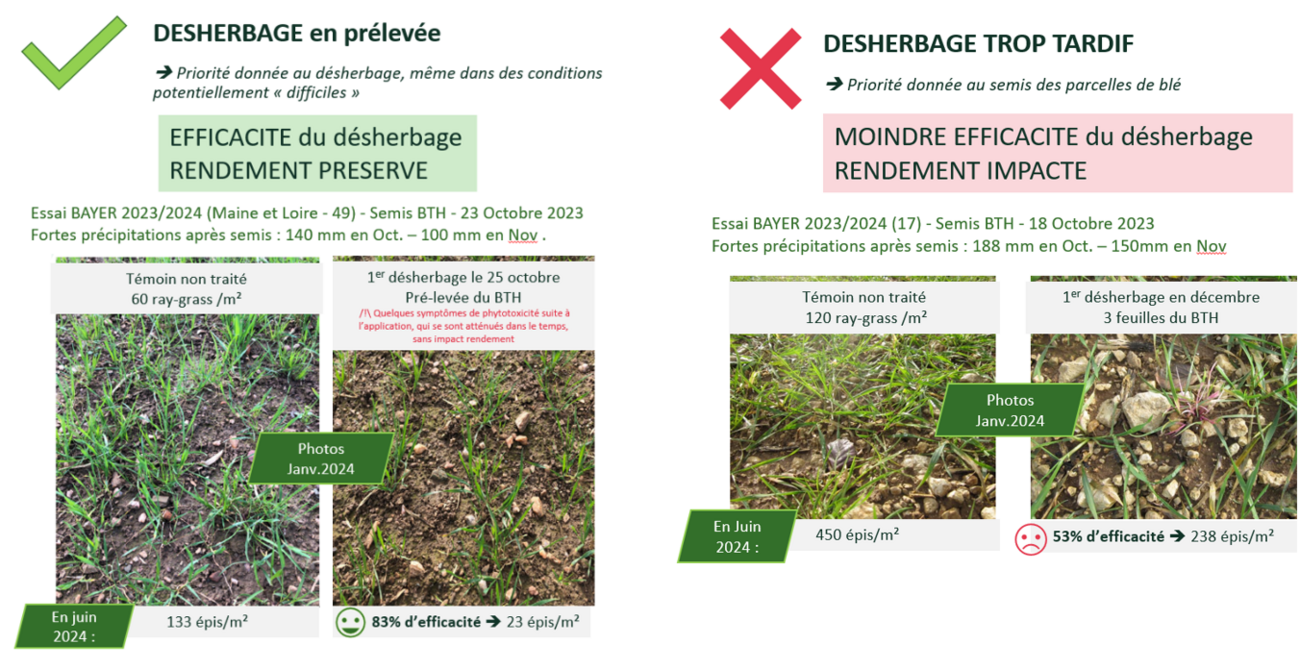 Coup d’œil dans le rétroviseur : au début de l’automne 2023, certains avaient dû donner la priorité au semis. Dans ces parcelles, compte tenu de la météo, les applications de pré-levée n’avaient pas pu être réalisées, les applications de post-levée précoces non plus :