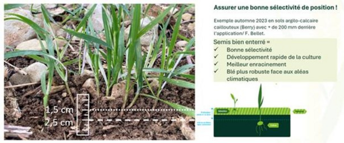 Positionner les semences de céréales plus profondément que les graines d’adventices pour qu’elles échappent à l’action de l’herbicide racinaire. La culture est ainsi préservée grâce à une sélectivité de position. Le produit appliqué n’aura pas d’impact sur la levée de la culture en place, mais sera efficace sur les adventices dont les graines se situent principalement dans la couche superficielle du sol.